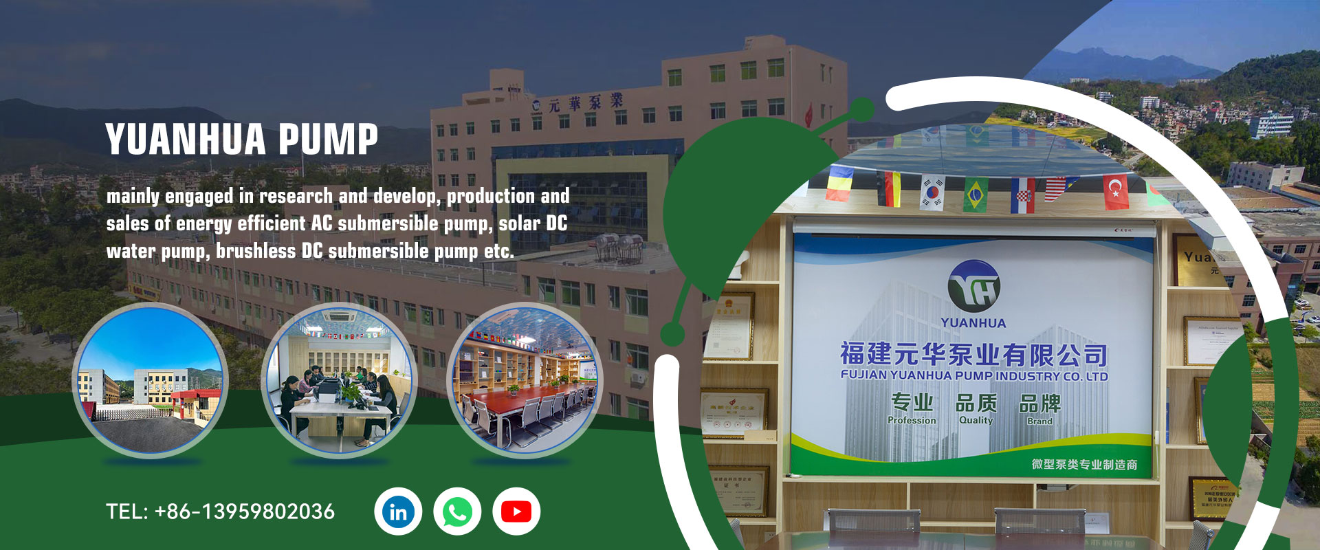 Men nu datterselskab-YUANHUA er hovedsageligt engageret i forskning og udvikling, produktion og salg af energieffektiv AC dykpumpe, solar DC vandpumpe, børsteløs DC dykpumpe osv. Vores produkter er meget udbredt i håndværksfontæner, havelandskaber, havevanding, biler, automatisk vandcirkulationsudstyr, solprodukter (en fuglefodsbadekar, luftbadekar, luftbadekar, fontæne til fuglebade). Desuden tilføjer vi nye produkter såsom afløbspumpe til vaskemaskine og RO pumpe til vandrenser.